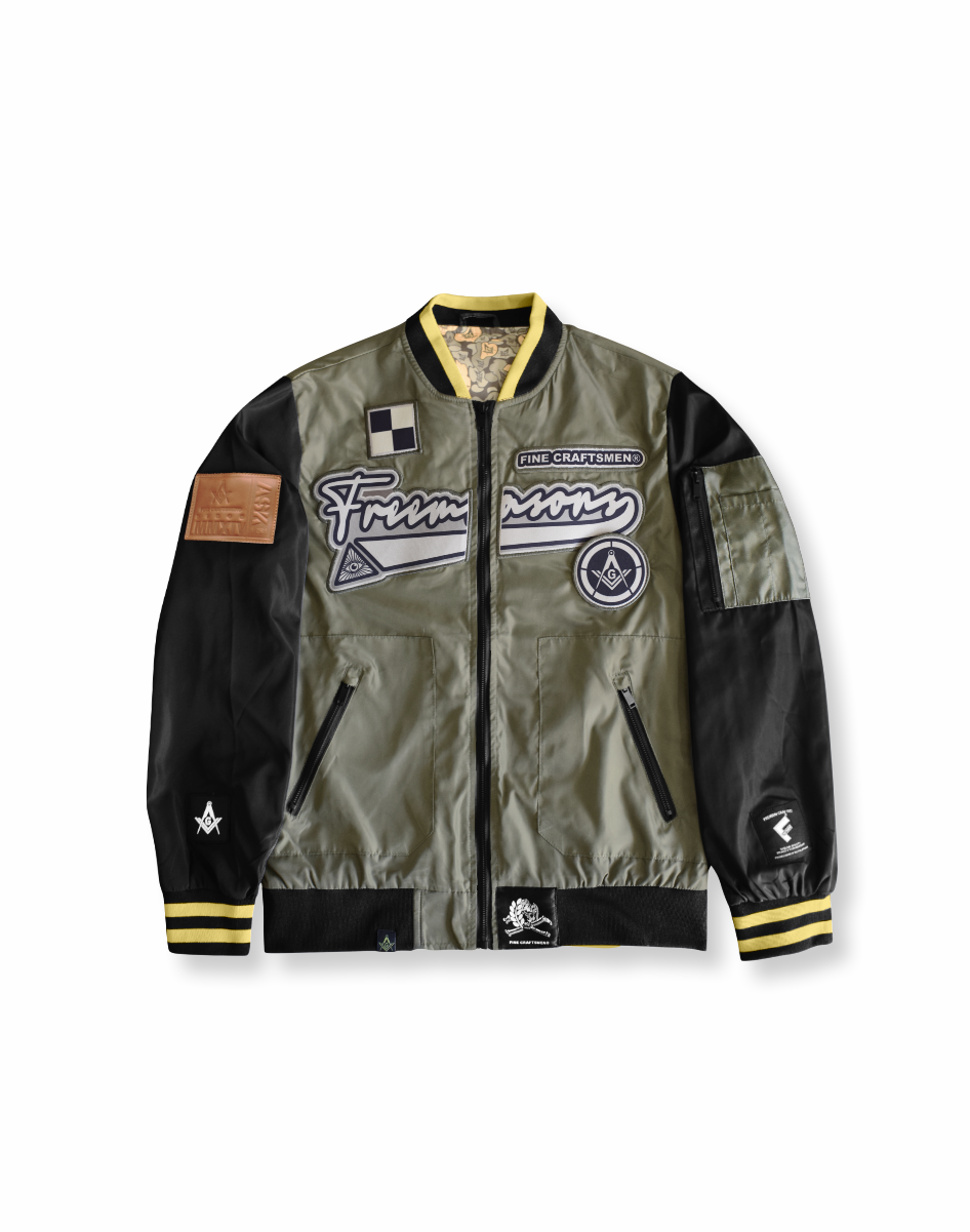 MULTIPLE MASON THEMED SUBLIMATION PATCHES. KNITTED COLLAR AND CUFFS LEFT SLEEVE POCKET WITH NEON GREEN LINING. DOUBLE FRONT ZIPPER ALLOWS FOR A VARIETY OF STYLING OPTIONS. WITH DURABLE WATER-REPELLENT NYLON FABRIC